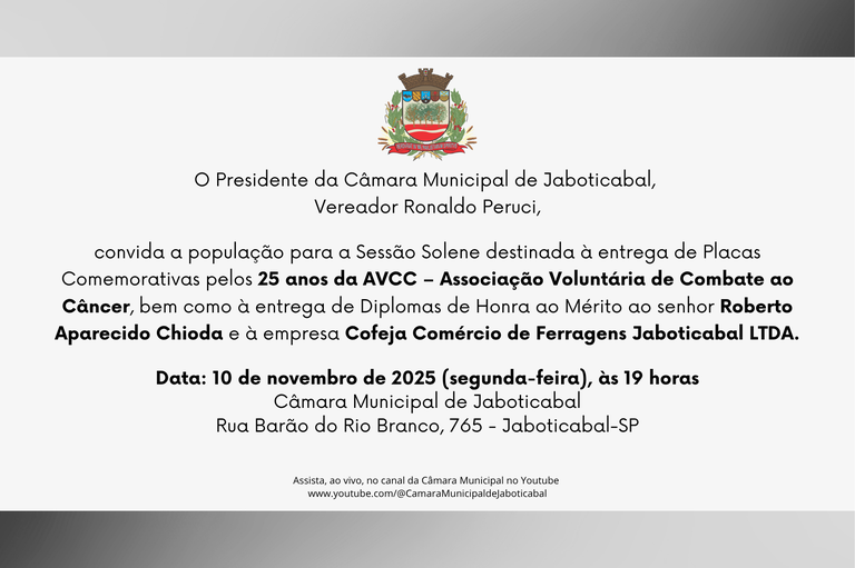 Câmara de Jaboticabal realiza sessão solene em homenagem aos 25 anos da AVCC e entrega Diplomas de Honra ao Mérito