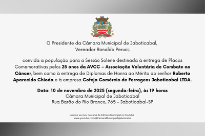 Câmara de Jaboticabal realiza sessão solene em homenagem aos 25 anos da AVCC e entrega Diplomas de Honra ao Mérito 31/10/2025 09h34