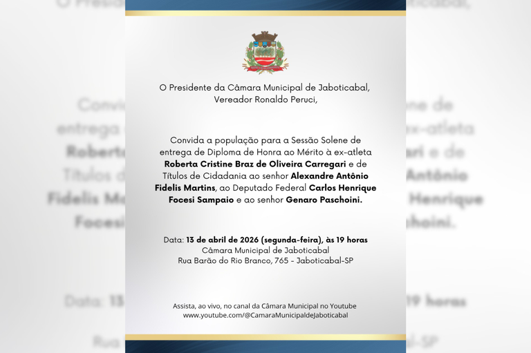 A Câmara Municipal de Jaboticabal realiza, no próximo dia 13 de abril (segunda-feira), às 19h, uma sessão solene no plenário do Legislativo para a entrega de Diplomas de Honra ao Mérito e Títulos de Cidadania Jaboticabalense. A cerimônia é aberta ao público, com transmissão pelo canal da Câmara no YouTube, e homenageará personalidades que se destacaram por suas contribuições ao município.
