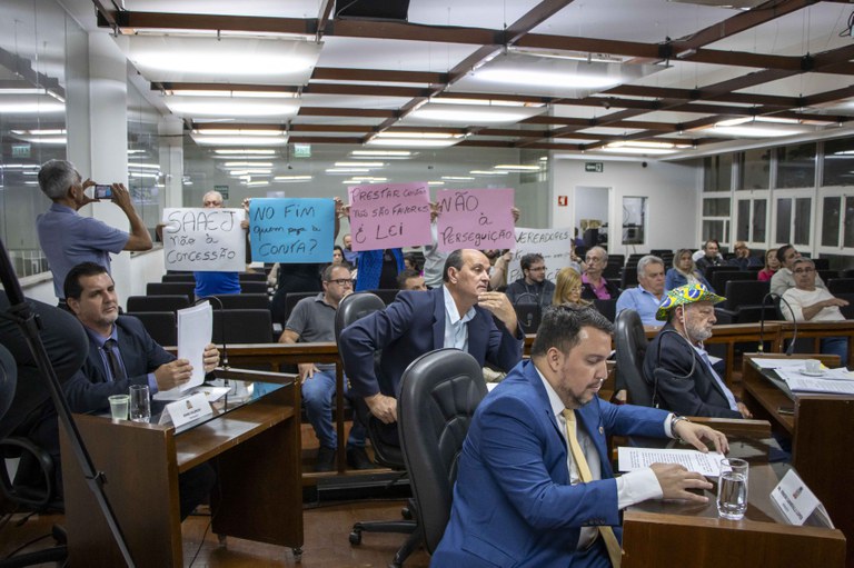 Munícipes protestam sobre a possível concessão do SAAEJ durante o uso da Tribuna Livre pela presidente do sindicato, Maria Elvira Armentano, na segunda-feira (20/10/2025).