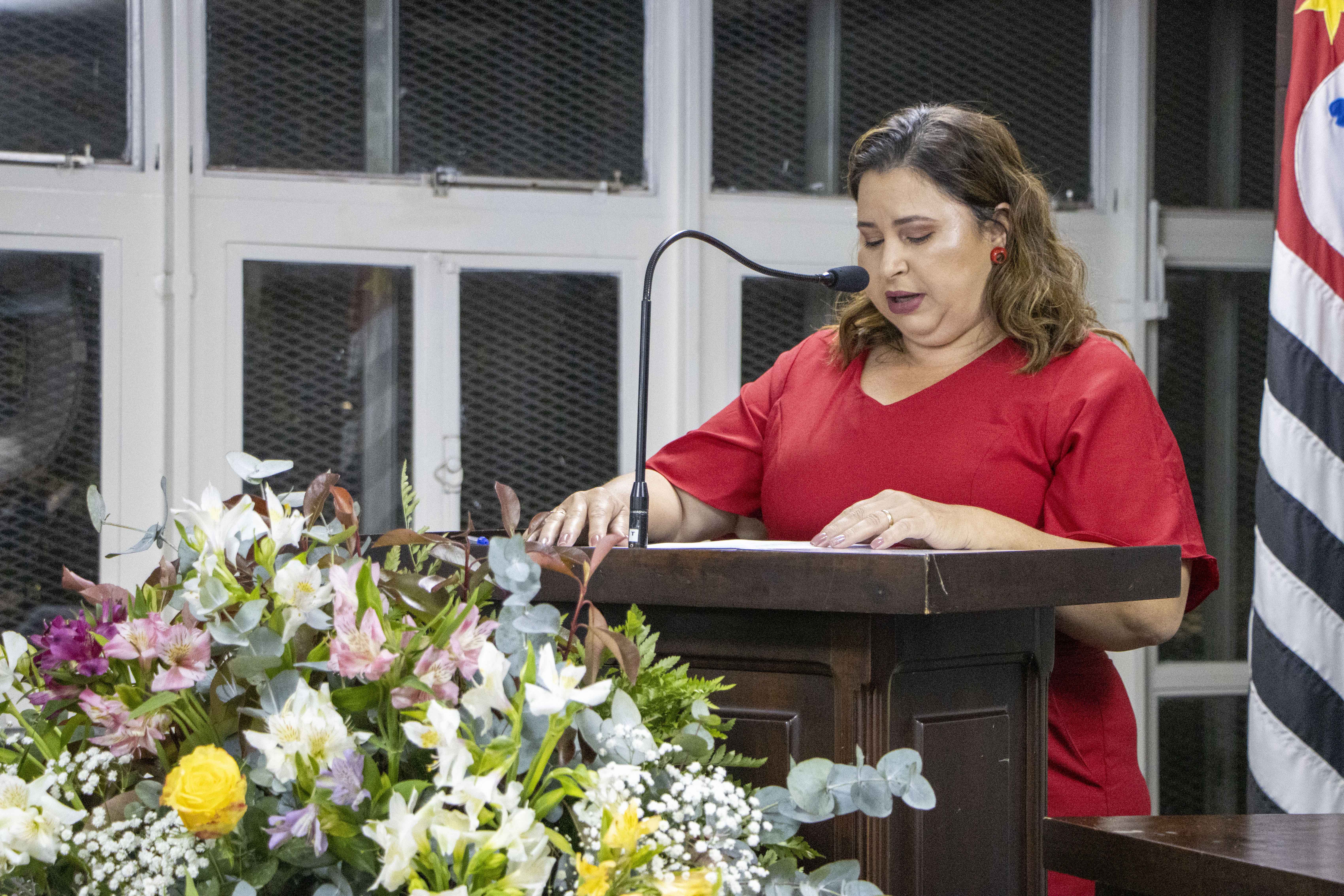Fernanda Junqueira Alves fala em nome dos homenageados na sessão solene de entrega de placas comemorativas a munícipes e empresários da cidade.