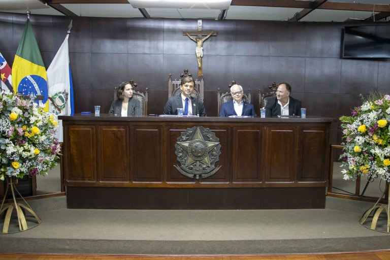 Mesa dos trabalhos da sessão solene: [esq. à dir.] Priscila Padovani, representando a Secretaria de Assistência e Desenvolvimento Social; presidente da Casa, vereador Ronaldo Peruci; secretário Municipal de Governo, Dr. Edu Fenerich, representado o prefeito Prof. Emerson Camargo; e o vereador autor da propositura de homenagem, Mandi Serralheiro.