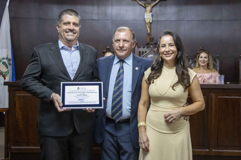 Proprietários da COFEJA, Alexandre Merenda e a esposa Lucimar Merenda, recebem Diploma de Honra ao Mérito pelas mãos do vereador Wilsinho Locutor, autor da homenagem.