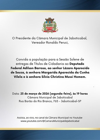 A Câmara Municipal de Jaboticabal realizará, na segunda-feira (23.mar.26), às 19h, uma sessão solene dedicada à concessão de títulos de Cidadania Jaboticabalense.