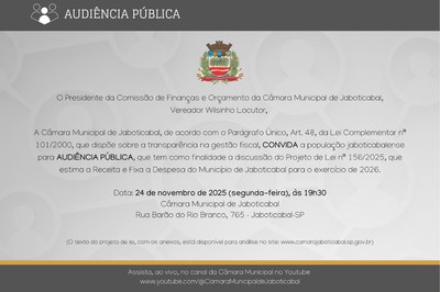 Comissão de Finanças e Orçamento discute LOA 2026 em audiência pública; orçamento de Jaboticabal está previsto em R$ 569,7 mi 19/11/2025 14h04